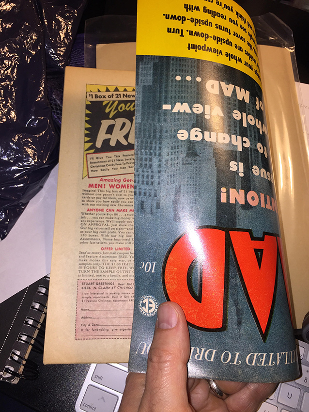 I sat down and, gingerly, gingerly, opened issue #17, the cover of which is only type, superimposed over a blue-tinted photo of skyscrapers. The copy promises that “This issue is going to change your whole viewpoint of MAD …” with a black and yellow banner across the bottom explaining that the insides are upside down. Sure enough, they intentionally attached the covers upside-down and backwards. Open the front cover and you see the last page of the comic upside-down. Even with the cover banner, I can’t imagine how many times they would have had to reassure their printer that this was what they really wanted to do.