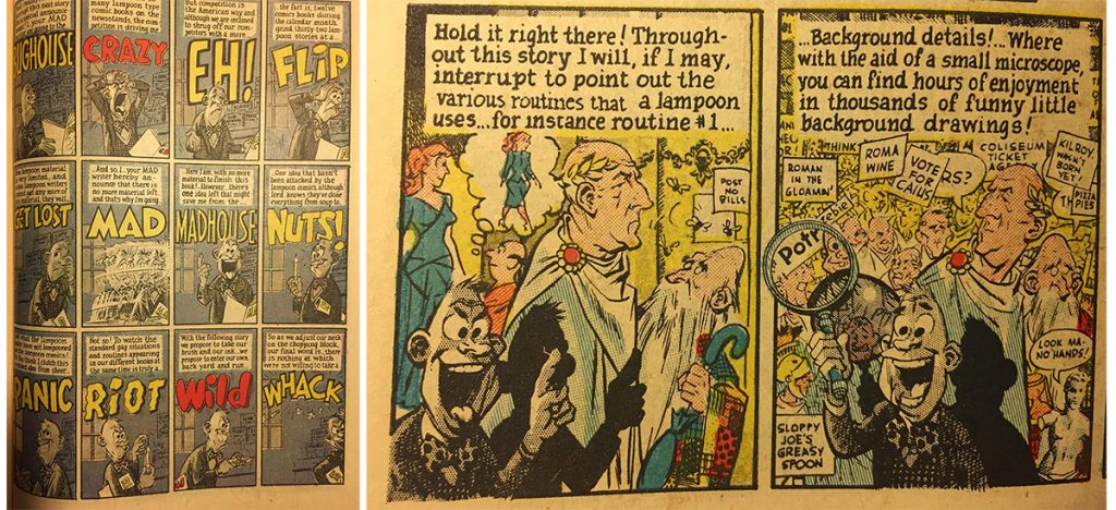The comic moves on to satirize corporate messaging, the concept of beauty, hedonism, and finally, at the end, it satirizes the very notion of satire. A figure that represents the writer standing in front of a comics rack is at loss because there are now 12 different monthly parody comics, (there really were!) and he works the name and logo of each one into a soliloquy that runs through successive panels on a 12-panel page (above, left). This leads into a magnificent act of sawing off the limb they’re sitting on a comic called Julius Caesar, which looks like it’s going to lampoon the Marlon Brando movie of the time, but instead shines a light on all the tired tropes and strategies that go into making a lampoon. Wally Wood draws the writer standing in front of the panels of the comic, casting a shadow on them as if he was lecturing in front of a movie screen, the chaos mounts, and by the end the reader is presented with new critical tools to scrutinize the very comic he’s holding (above, right).