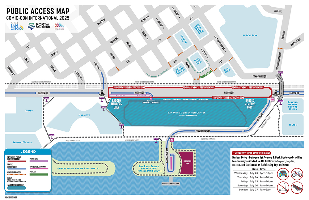 The San Diego Convention Center, in partnership with the Port of San Diego and the City of San Diego, are providing information to assist attendees, the general public, and stakeholders about pedestrian and vehicular access, restrictions, and detours during Comic-Con.
