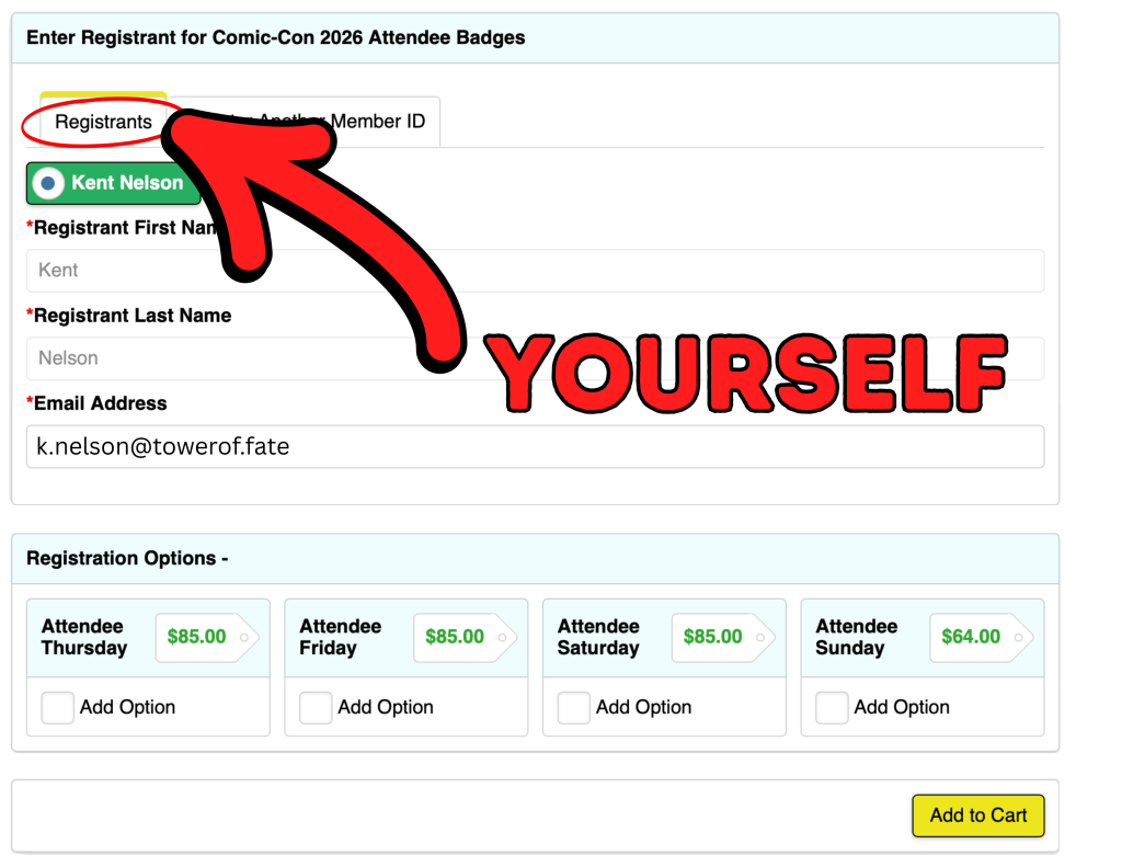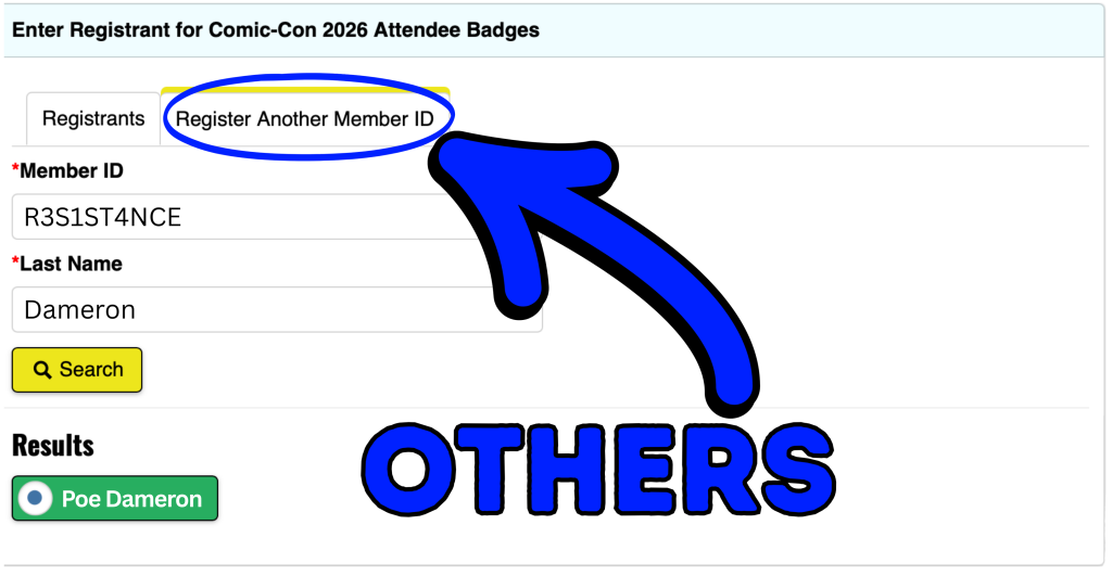 Below the instructions on the registration page, you’ll see two tabs: “Registrants” tab and a “Register Another Member ID.” Which tab you use depends on who you’re purchasing for. If you want to attend Comic-Con 2026, review the “Pick Your Badges” steps below. We recommend adding your badges to the cart first before making any other selections.