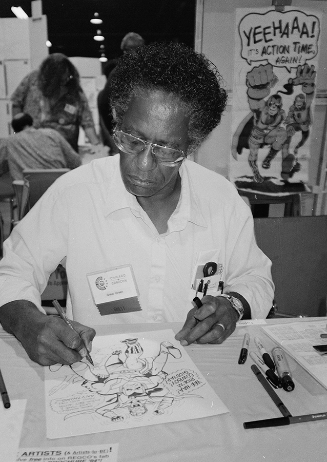 Grass Green was an American underground comix artist and part of the pioneer generation of the 1960s. He’s best known for creating superhero parodies like Xal-Kor the Human Cat (1964) and Wildman and Rubberroy (1969), as well as erotic stories for underground comix and the Eros Comix line by Fantagraphics. Green holds historical significance for being the first black underground comix artist. He also created REGCo, which offered comics artists pages where the layout, borders, and panels were already put on paper beforehand.